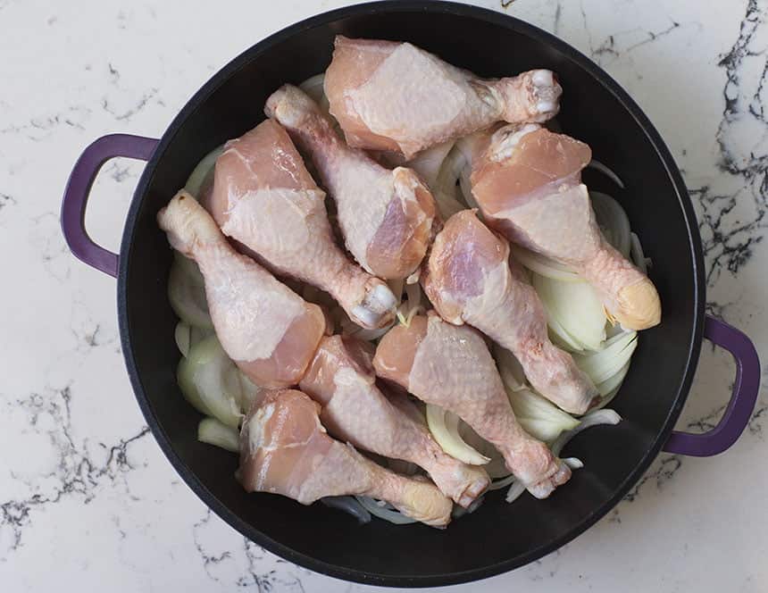 מעליהם (בלי לעשות כלום עדיין) אני מסדרת עם העוף (אפשר גם כרעיים), שאגב לפעמים אני מוציאה ישר מהמקפיא לסיר. אפשר להכין עם עור או בלי עור.